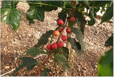 コーヒーの実は、花が散るとその後に緑色の小さな実がなります。その実は大きくなるにつれ黄色くなり、さらに熟すと赤く変化します。