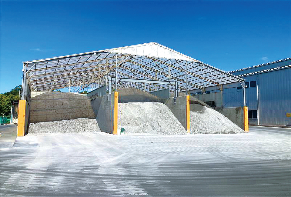 製品(再生路盤材)を保管する場所です。過剰な在庫を持たず、6区画(1区画約170㎥)をローテーションして使用して需要分だけを製造・保管しています。