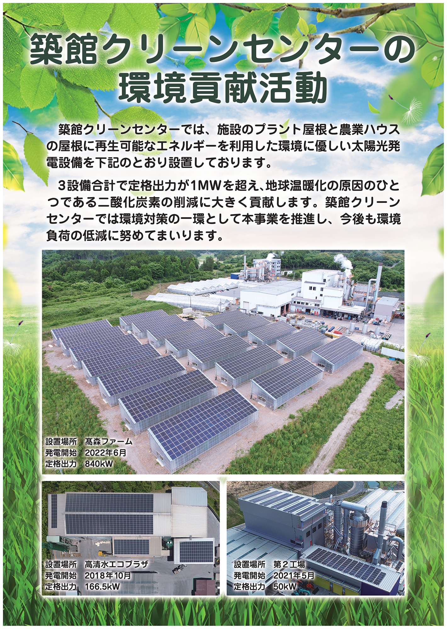 農業用ハウスでは焼却炉からの排熱を利用し果実植物などを栽培してます。また、ハウス屋根に太陽光パネルを設置し定格出力840kWの発電し焼却施設などに自家消費として供給してます。